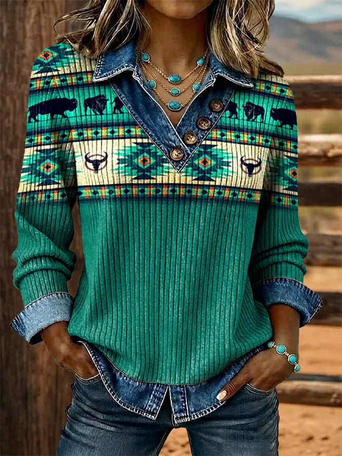 Women'S Casual Lapel Color-Block Printed Patchwork Sweatshirt