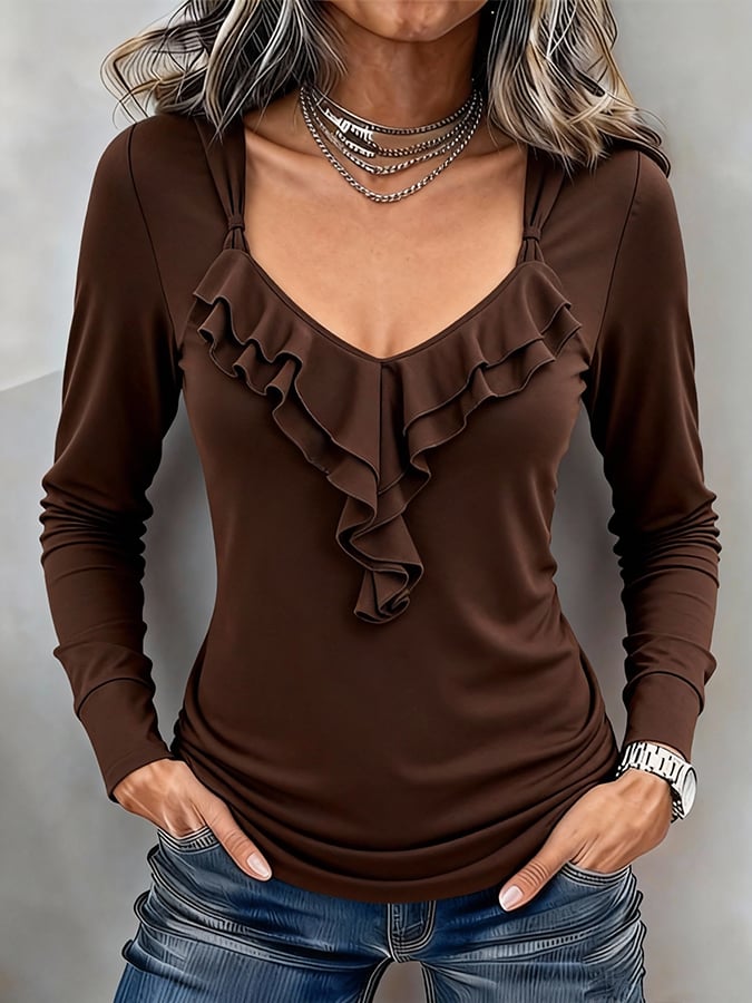 Women'S Casual V-Neck Solid Color Long-Sleeved Top