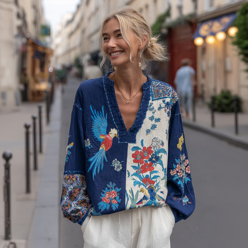 Women's Patchwork Art Floral And Bird Pattern Comfortable Top